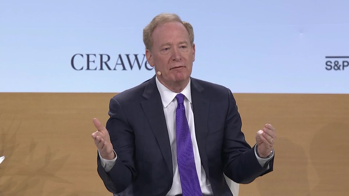Microsoft Corp. President Brad Smith says the company puts its own safety guardrails around artificial intelligence. He speaks during a panel discussion at CERA Week in Houston. (Source: Bloomberg)