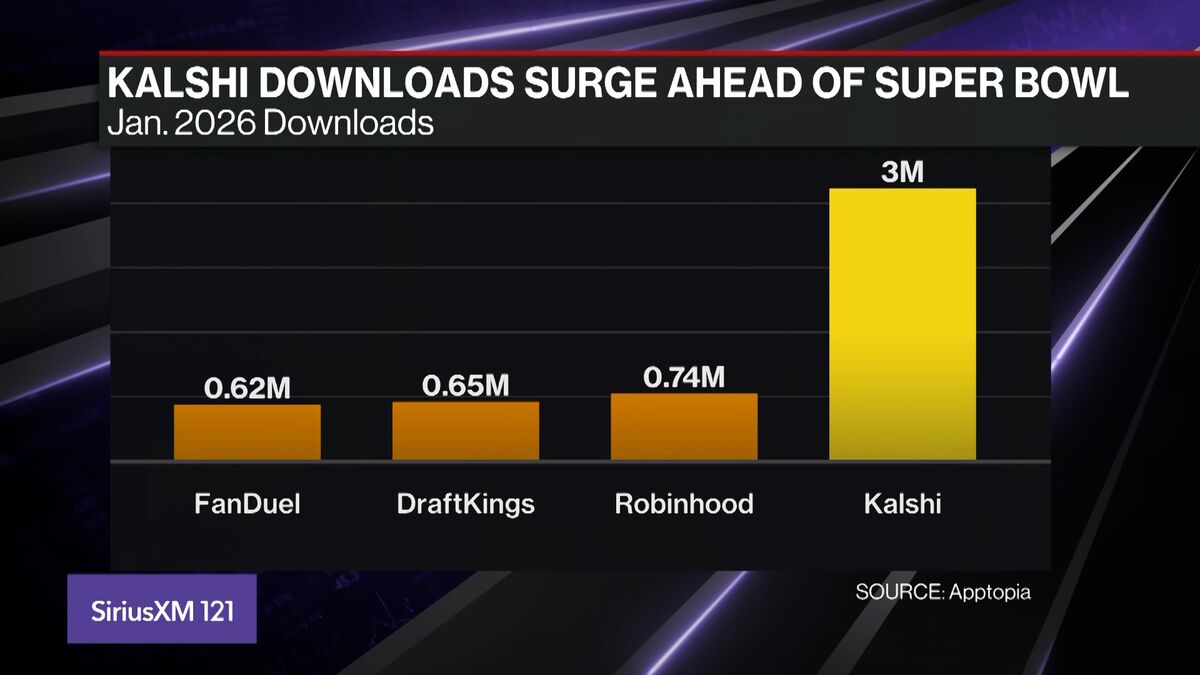 Derek Stevens, Circa Resort & Casino CEO, Circa Sports CEO joined Bloomberg's Balance of Power and discussed the climate of sports betting ahead of this weekend's Super Bowl. Just months ago, Kalshi Inc. lagged far behind FanDuel and DraftKings — the dominant players in US sports betting. Now, ahead of the Super Bowl, the crown jewel of the gambling calendar, the upstart prediction market has pulled far ahead, at least by one key metric: monthly app downloads. In January, Kalshi was downloaded 3 million times, more than four times the tally for either DraftKings Inc. or FanDuel, a US unit of Flutter Entertainment Plc — and more than either of those companies even during their fastest periods of growth — according to the data firm Apptopia. FanDuel said it had 3.5 million active monthly users in its most recent earnings report. (Source: Bloomberg)
