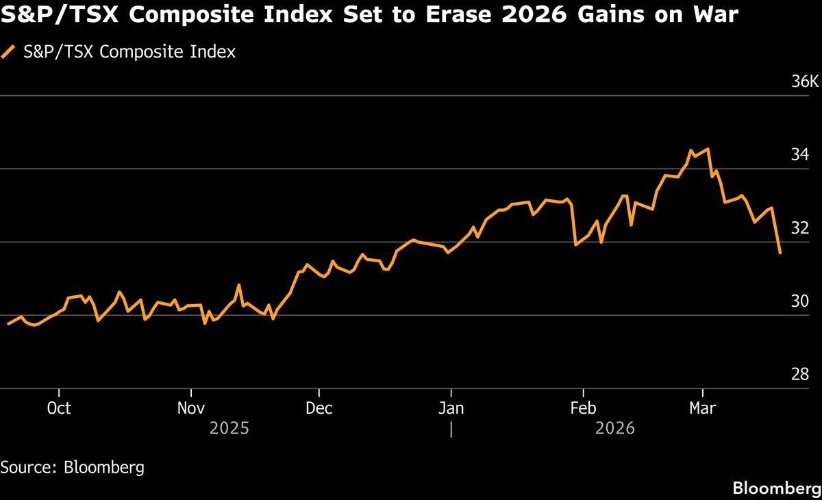 The Iran war has weakened gold prices, with the commodity falling for a seventh straight session on Thursday as the conflict escalated. The drop means Canada’s stock index, which is heavily tilted to the metals sector, is set to give up its 2026 gains.